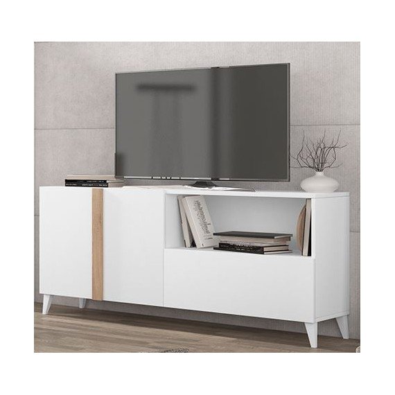 MUEBLE TV LISBOA CON PATAS, en blanco combinado roble.