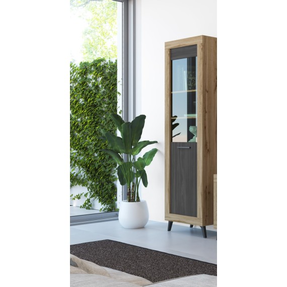 Elegante vitrina 1 pta con cristal en roble combinado roble mina. Medida 60 x 203 cm aprox